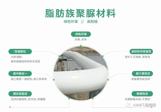 青島海洋新材料自主研發(fā)的聚脲/聚氨酯管道防腐材料在行業(yè)領(lǐng)域應(yīng)用頗為突出,具有壽命長、綠色環(huán)保、一體成型無縫連接等性能。我公司防腐材料執(zhí)行歐美國際標(biāo)準(zhǔn),直飲水管道防腐材料通過英國WRc-NSF及山東省衛(wèi)生和計(jì)劃生育委員會頒發(fā)的飲用水認(rèn)證證書。